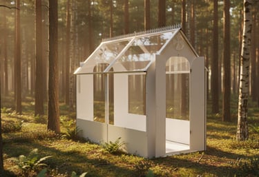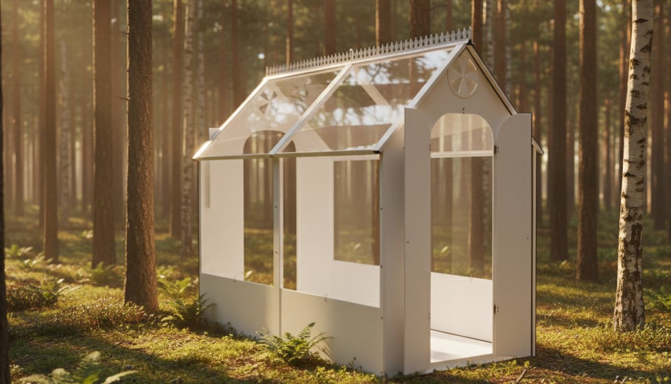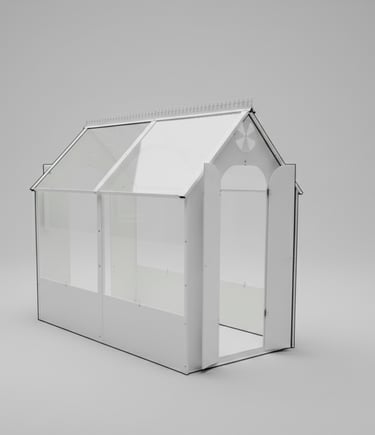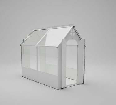 Ett unikt växthus med fokus på enkel montering och hög hållfasthet. Tillverkat av 3 mm stålplåt och 4 mm härdat glas. Monteringen är snabb eftersom konstruktionen huvudsakligen sätts ihop med M8-vagnsbultförband. Dörrar och ventiler finns i båda gavlarna. Kan tillverkas på beställning hos Byström Form i tre varianter: oförzinkad stålplåt, förzinkad plåt eller förzinkad och pulverlackad plåt. Mått: ca 1,4 x 2,8 m. Vikt: 350 kg.