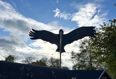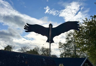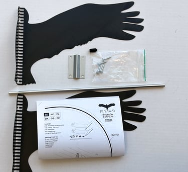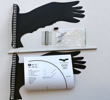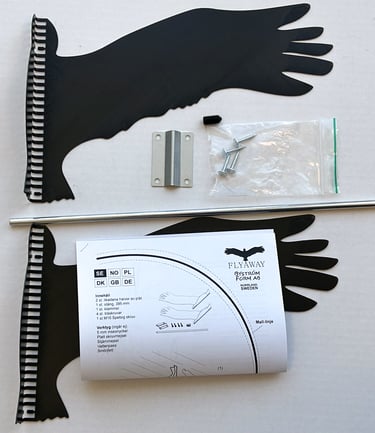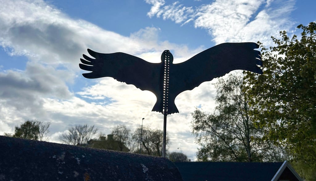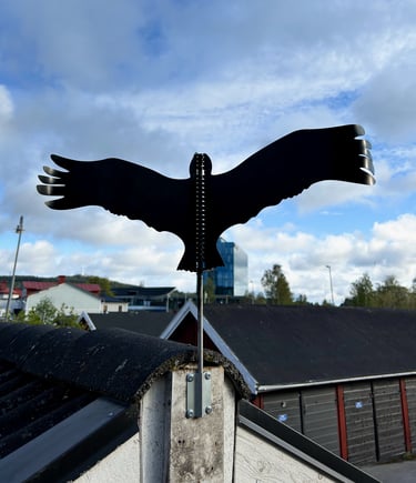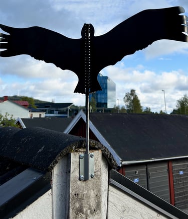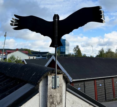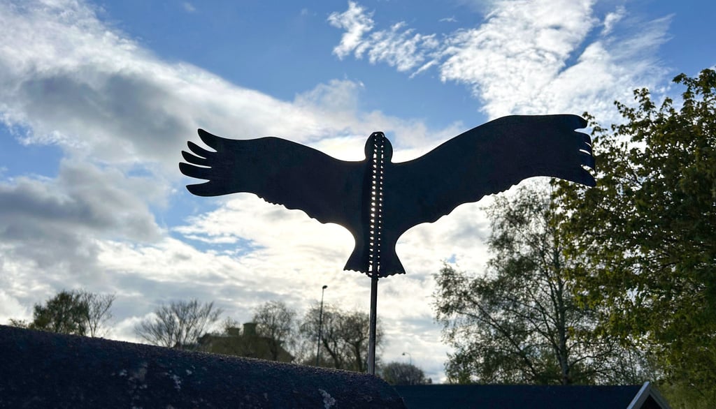 En dekorativ fågelskrämma som effektivt minskar antalet fåglar i närheten. Tillverkad i tålig svartförzinkad stålplåt. Skrämman börjar rotera vid vindhastigheter från 2 m/s och imiterar en flaxande rovfågel. Snygg och funktionell design, avsedd för åretruntbruk utomhus.