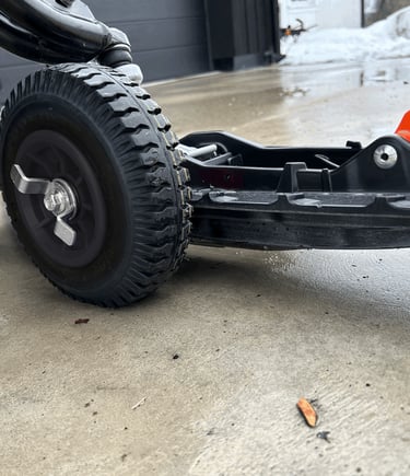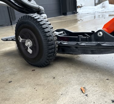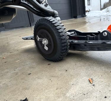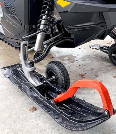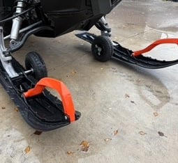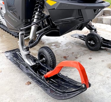 Transporthjul för snöskotrar som underlättar hantering på snöfria underlag, t.ex. i butik, garage, släpvagnar eller vid kortare transporter på väg. Skyddar skidor och styrstål samt förbättrar manövrerbarheten. Den rostfria hjulaxeln stöds mot flänsen på skidbultens M10-mutter och blir därmed självlåsande. Vikt: 2 kg (1 kg per hjul). Pågående patentansökan.